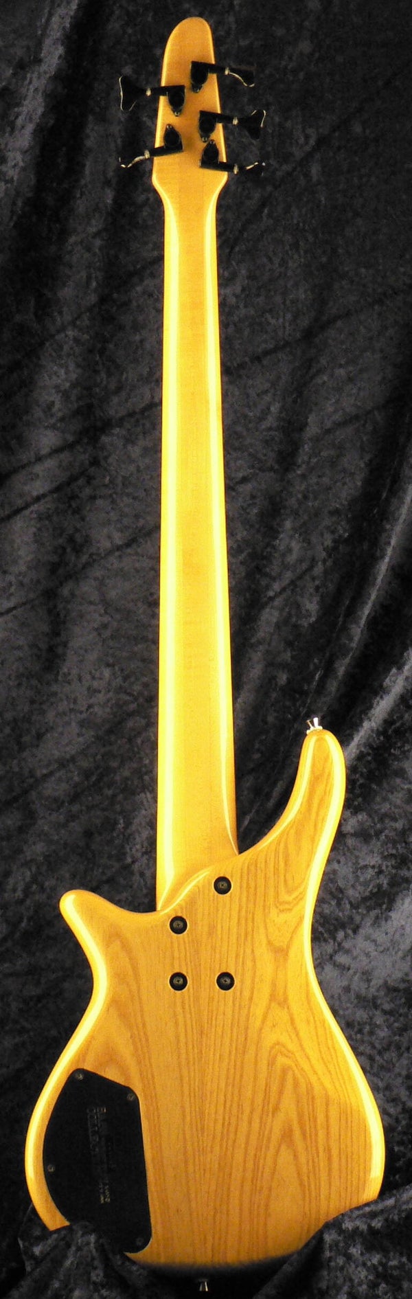 High end japanse 5-snaar gebouwd door SGC Nanyo. Essen body. De geschroefde hals bestaat uit 3 delen kwartiers gezaagd flame maple en is voorzien van een ebben toets met een 16” ronding en 24 frets. Het bescheiden formaat van de body houd het gewicht van dit harde hout toch comfortabel laag.