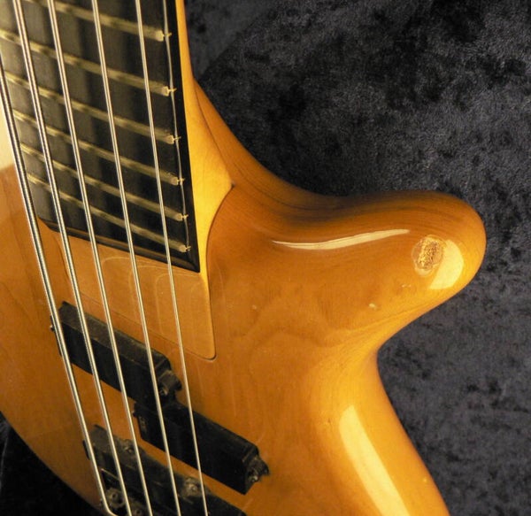 High end Japanese 5-string built by SGC Nanyo. Ash body, bolt on neck composed of 3 pieces of quarter sawn flame maple. Ebony fingerboard with 16” radius and 24 frets. The relatively small body keeps the weight of comfortably low.