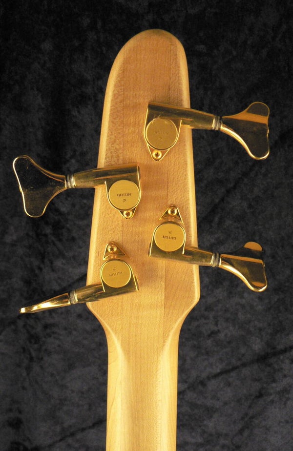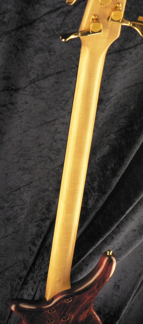 Whatever the precise typenumber may be, this is a very serious and stable active 4 string instrument with a very comfortable balance and weight. The neck is made of three pieces of rock maple with a 24 fret ebony fingerboard. It features a brass nut, Gotoh bridge and tuning machines, The pickups and active electronics are by SGC Nanyo themselves. The controls are straightforward but effective: Master volume, panpot, bass and treble pots.
